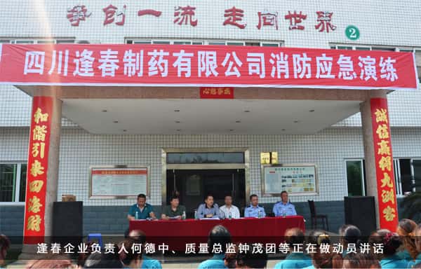 逢春制藥企業(yè)負(fù)責(zé)人何德中、黨支部書記質(zhì)量總監(jiān)鐘茂團(tuán)、九寨溝藥業(yè)生產(chǎn)負(fù)責(zé)人陳利民以及中江縣公安龍華派出所的領(lǐng)導(dǎo)出席了本次消防應(yīng)急演練。